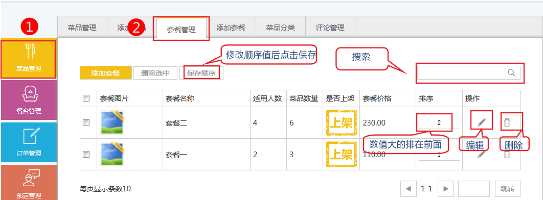 依次点击“菜品管理”——“套餐管理”,实现添加套餐、设置显示顺序、编辑套餐,删除套餐等功能