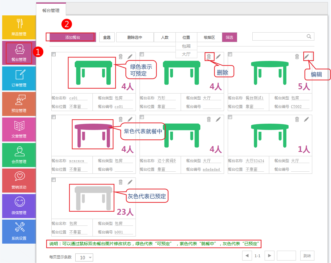 1.在餐台管理可以添加、编辑、删除餐台并且可以改变餐台状态。