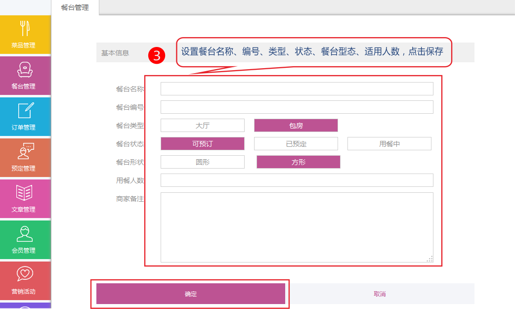2.设置餐台名称、编号、类型、状态、餐台型态、适用人数,点击保存这样前台的预定餐台功能就能实现啦